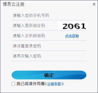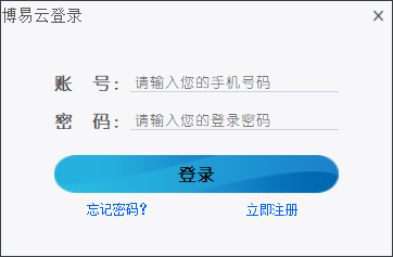 点击菜单栏最右侧的【博易云未登录】,调出博易云登录界面,点击右下方的【立即注册】,如图7-2-1;即可调出博易云注册界面,如图7-2-2。