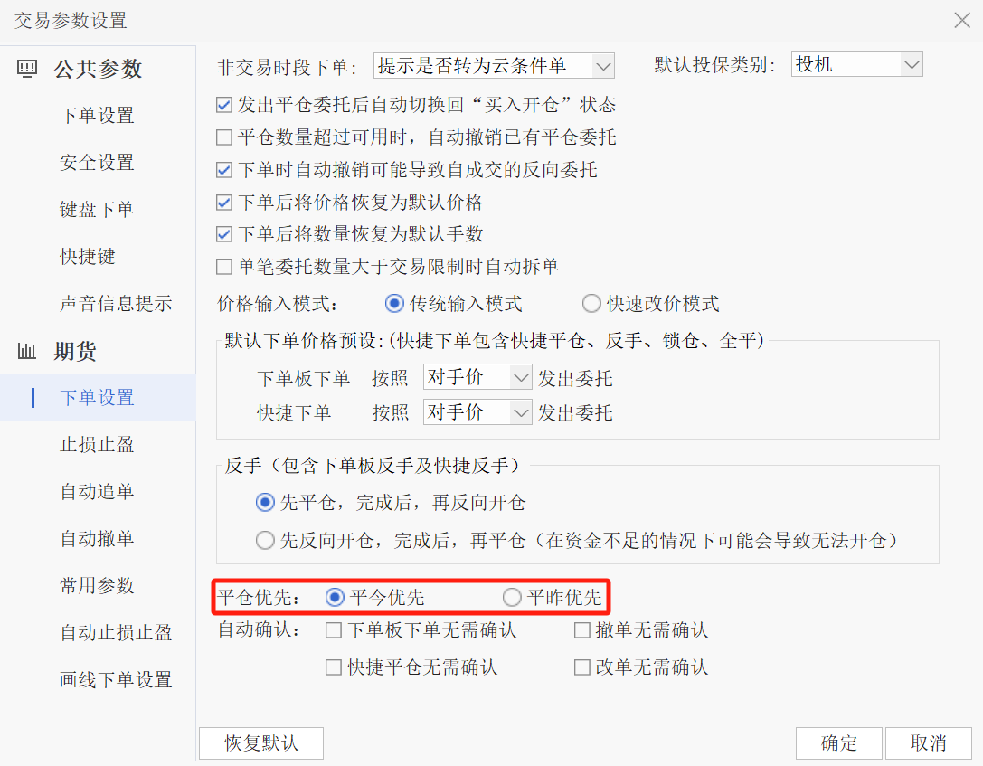 登录交易后,可在左侧功能模块中点击【参数设置】-【期货】-【下单设置】,设置上期所和SHFE-INE合约平仓时是平今优先还是平昨优选(如图10-2-11)。