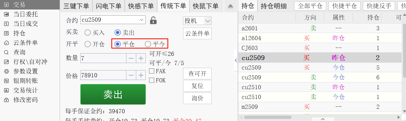 3) 数量输入框右侧显示可平\今,可平为可平今仓与可平昨仓的总数量,可平今为可平今仓的数量。