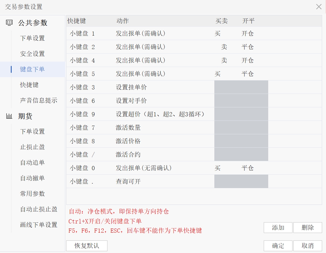 注意:F5、F6、F12、ESC、回车键不能作为下单快捷键。