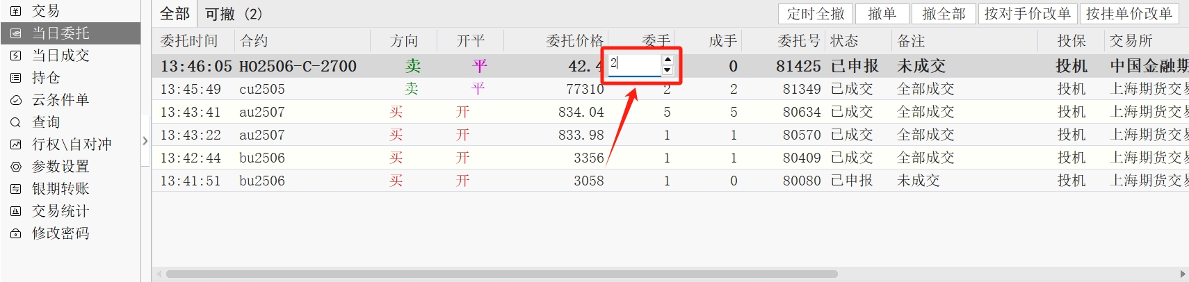 2) 修改数量:在未成交的委托行里,点击委手下的输入框或者点击鼠标右键选择【修改数量】,可在输入框中直接输入需修改的手数(如图15-1-5),修改完成后点击Enter键或空白处,会弹出改单提示对话框,点击【确认】,可撤销原委托并按照修改后的手数重新下单。