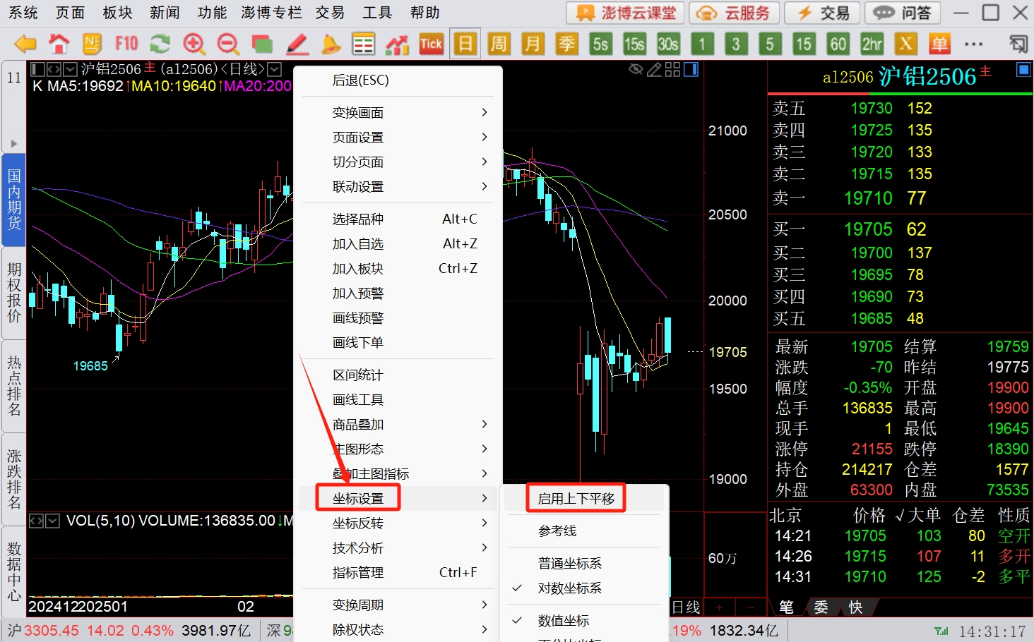 8. K线上下平移:点击鼠标右键选择【坐标设置】(如图6-3-10),启用上下平移后,在K线处长按鼠标右键即可拖动K线上下左右移动。